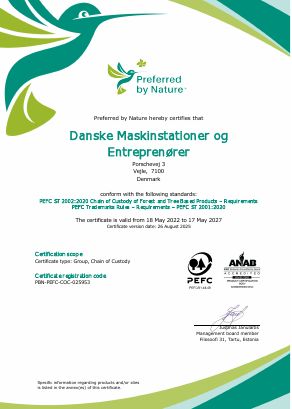 Dansk Maskinstationer og Entreprenørs CoC-certificeringskode: NC-PEFC/COC-025953